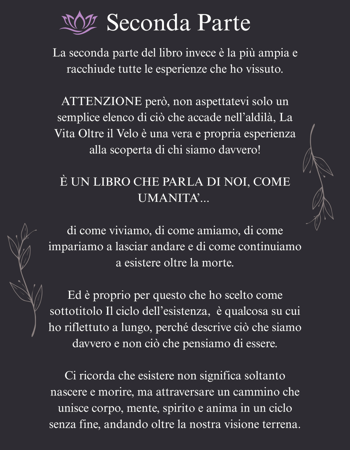 La seconda parte del libro invece è la più ampia e racchiude tutte le esperienze che ho vissuto. ATTENZIONE però, non aspettatevi solo un semplice elenco di ciò che accade nell’aldilà, La Vita Oltre il Velo è una vera e propria esperienza alla scoperta di chi siamo davvero!